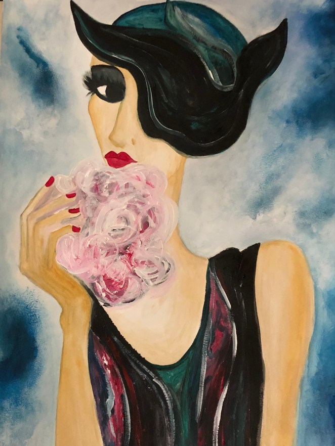 As for the story behind this painting, I’d finally gotten sick of seeing her incomplete. Filling in the blank space required committing to decisions about color and texture; fleshing her out from one to multi-dimensional, parallel to my book which now has two additional chapters. I want to be done but it needs to be done right.